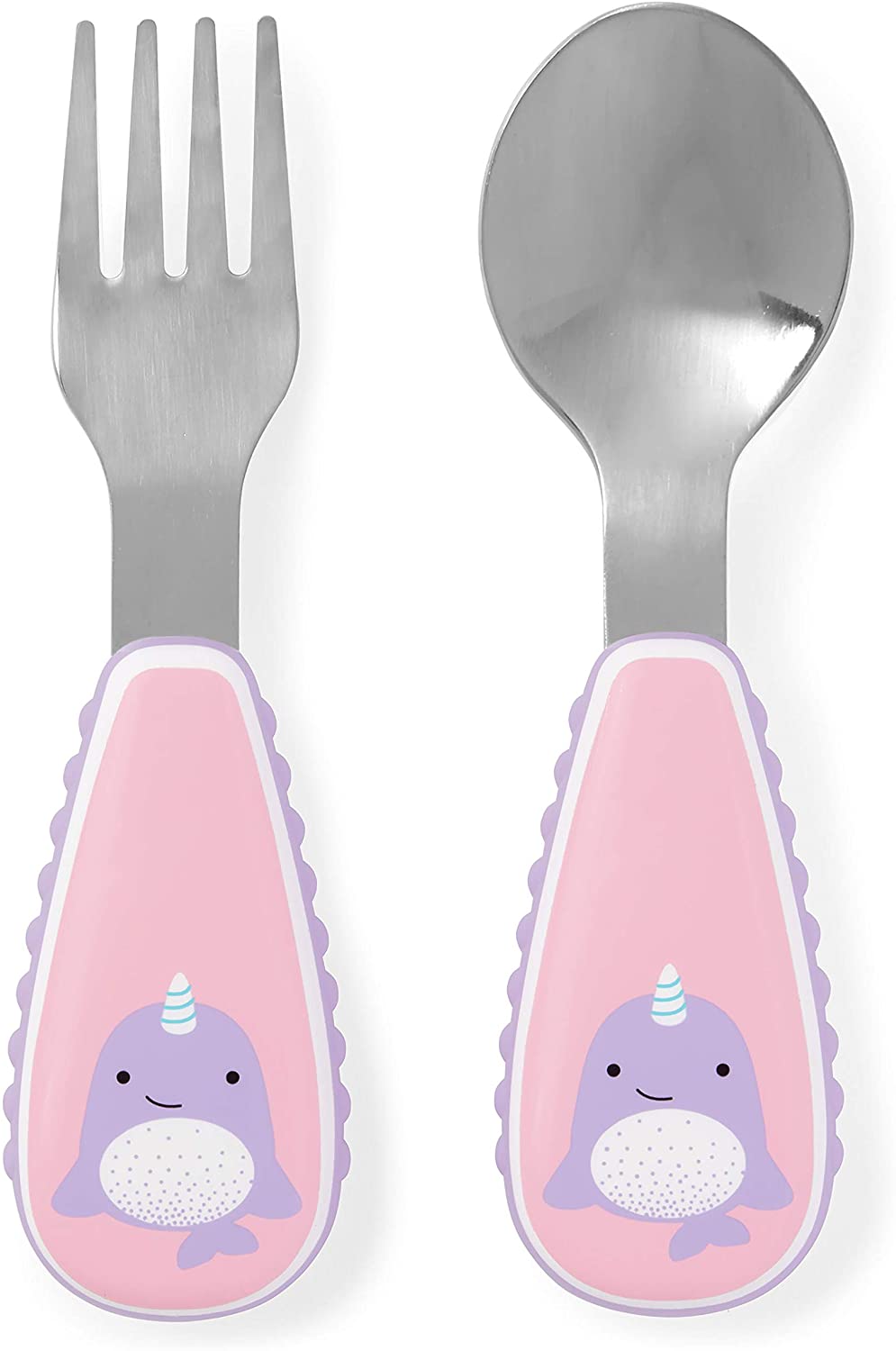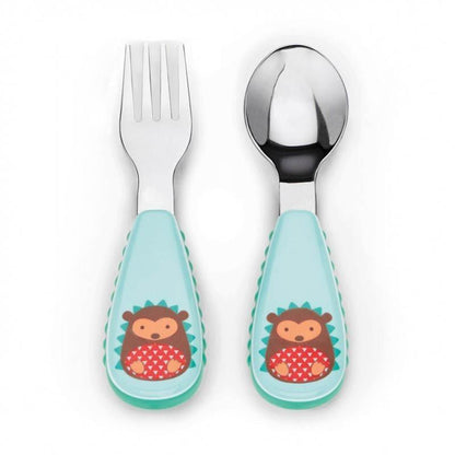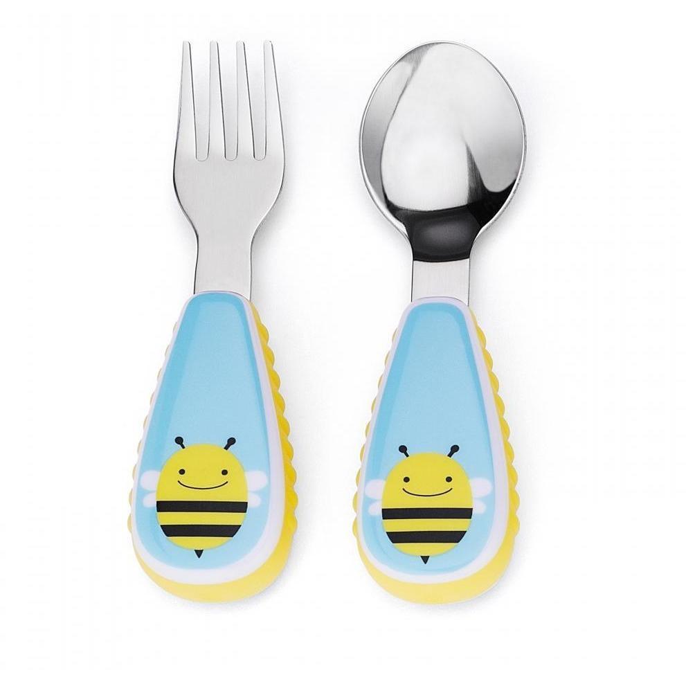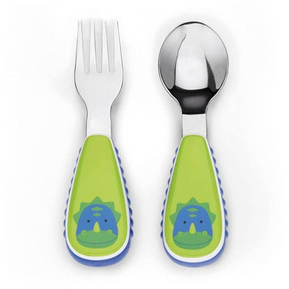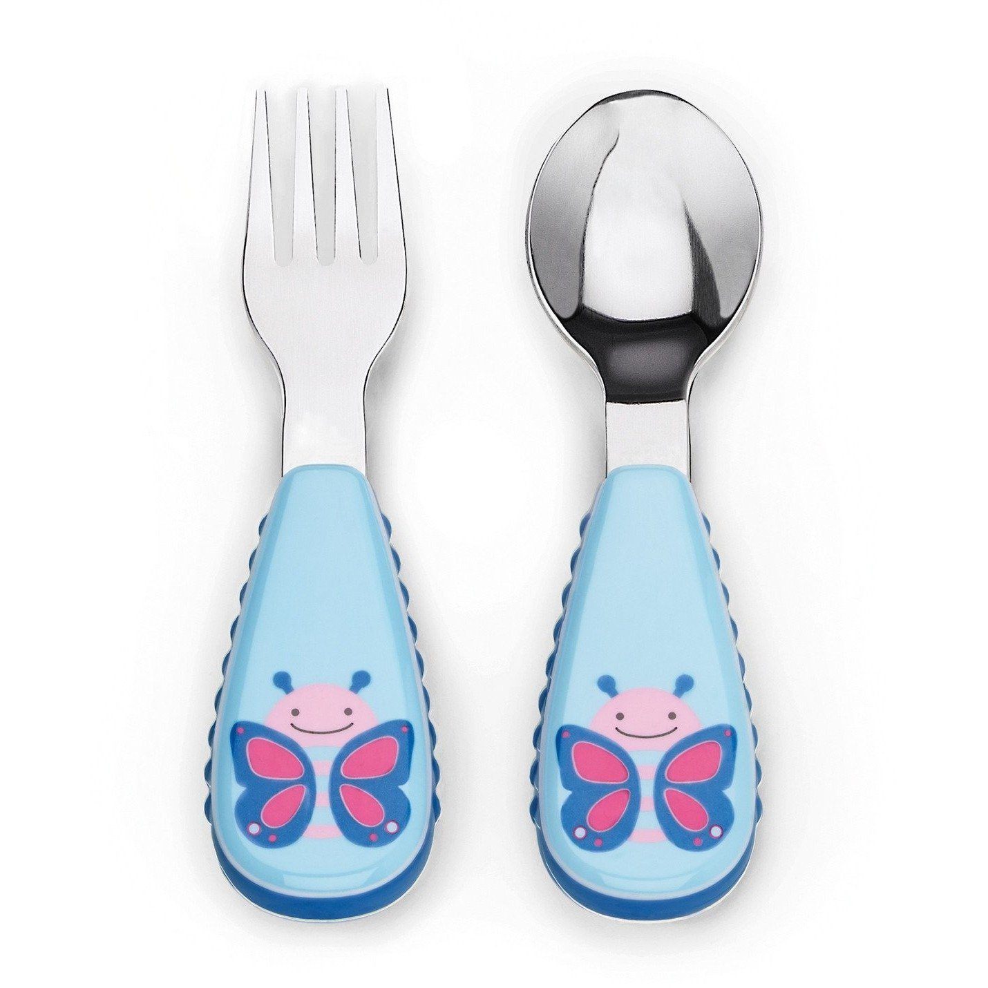 Esta colher e garfo adoráveis alças laterais macias por isso é fácil para os pequeninos segurarem. Cabeças de aço inoxidável fazem os mais pequenos se sentirem crescidos!