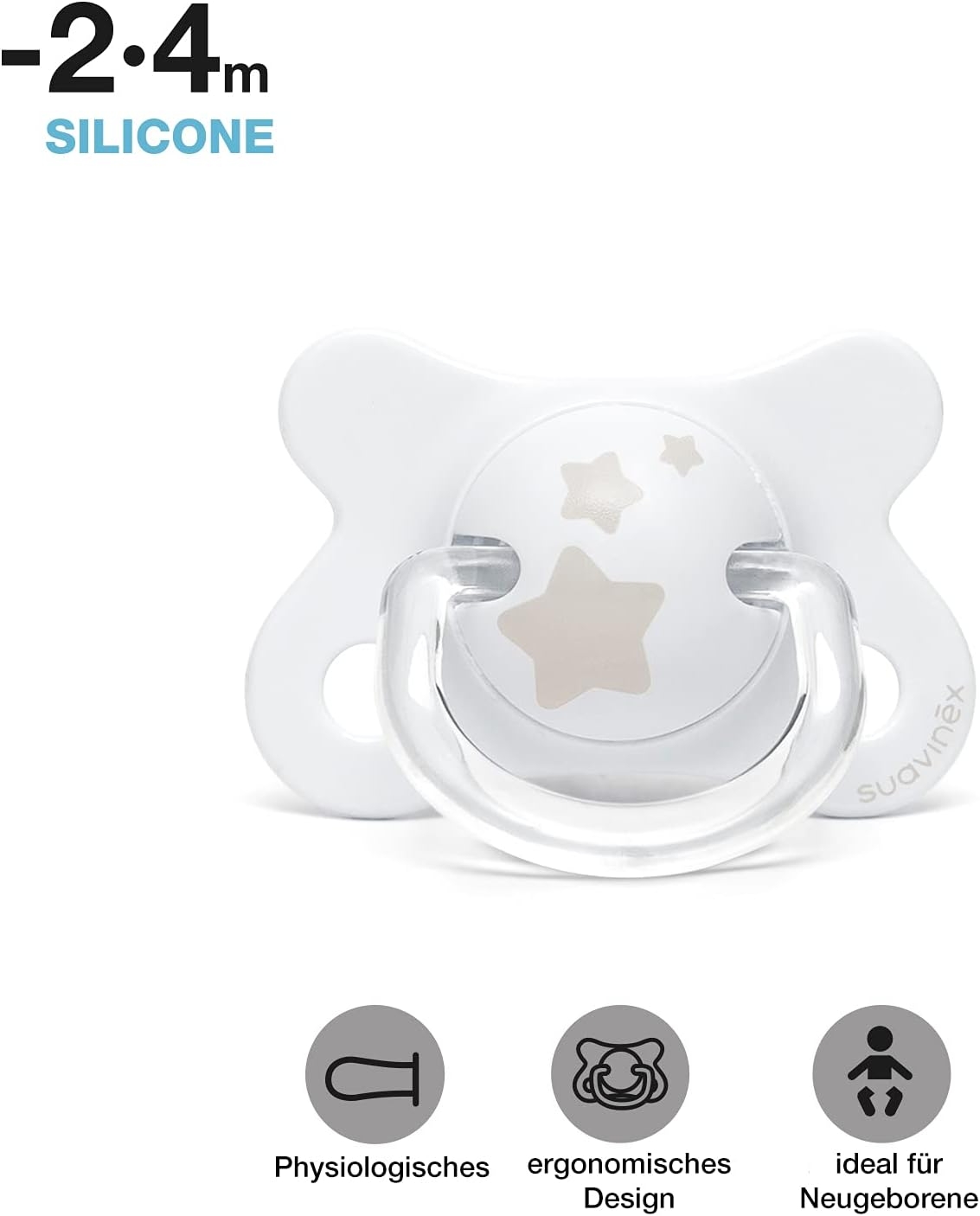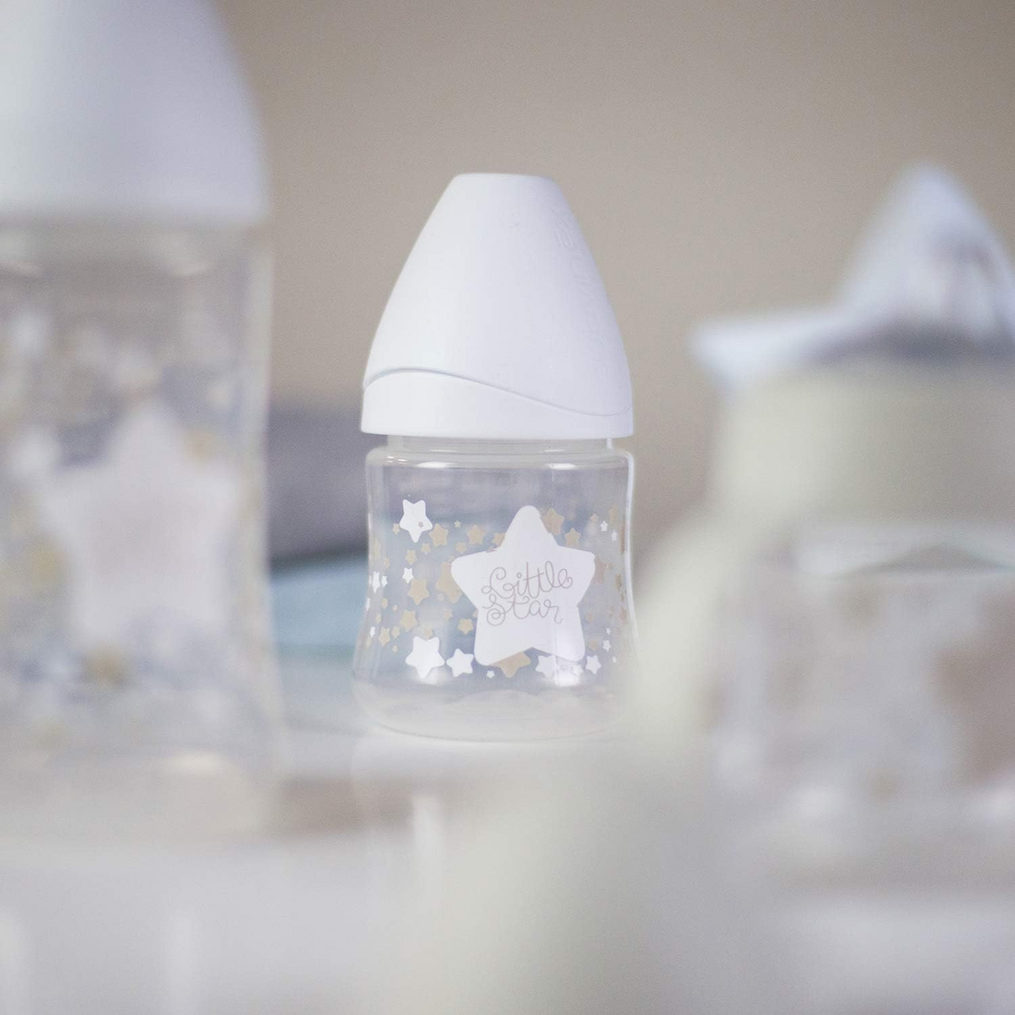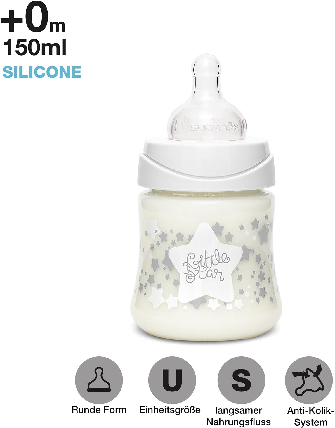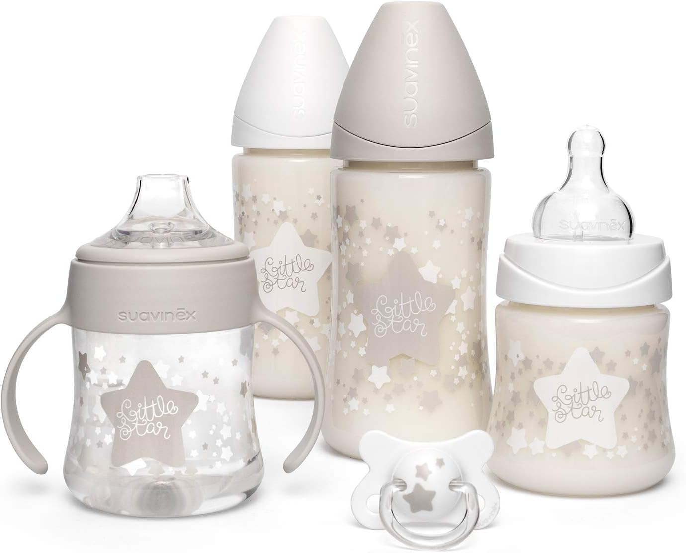 SUAVINEX Conjunto para recém-nascidos, 2 mamadeiras 270 ml + mamadeira 150 ml + biberão 150 ml com pegas + chupeta fisiológica -2-4 meses com tetina de silicone, cor: branco