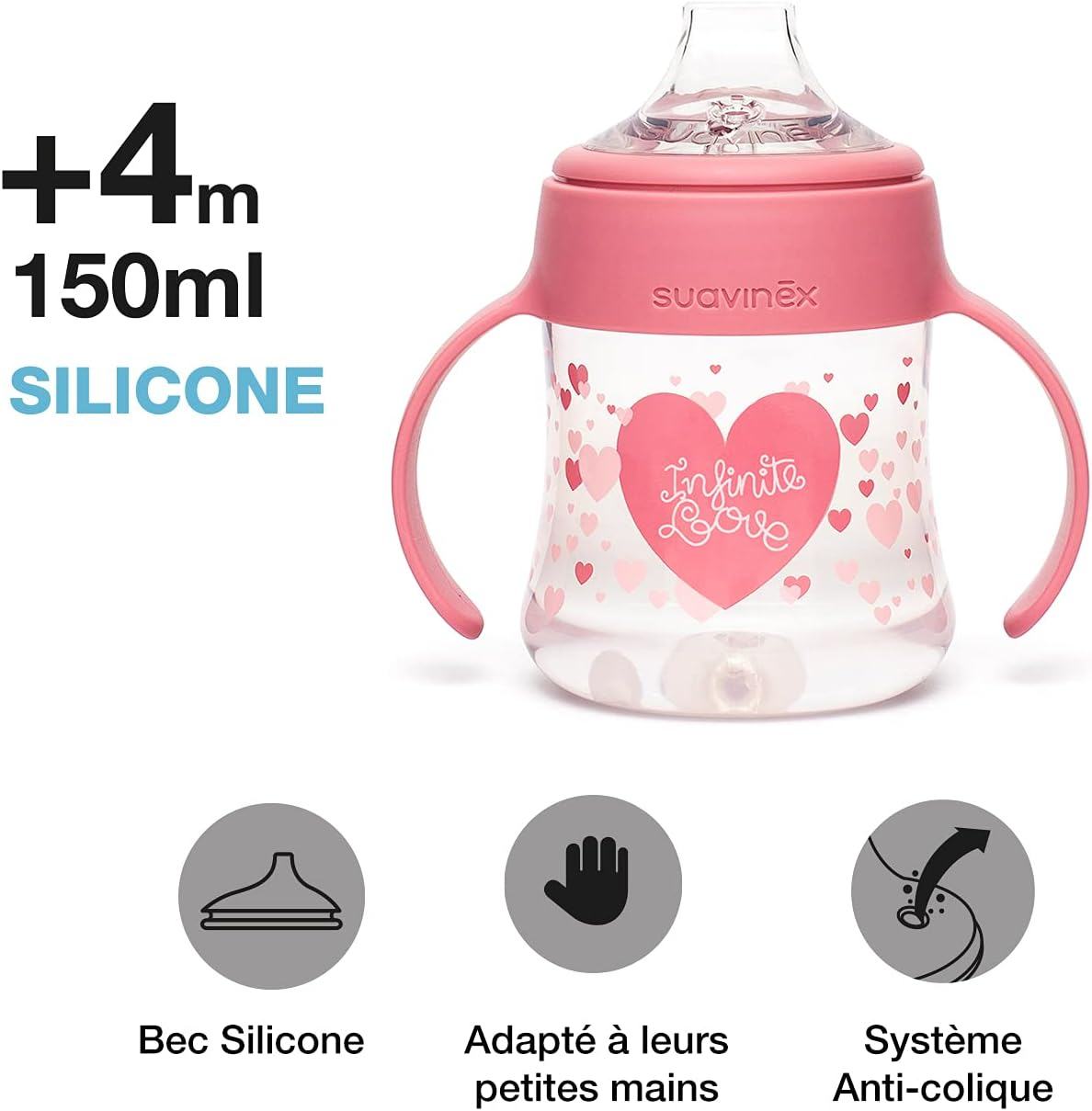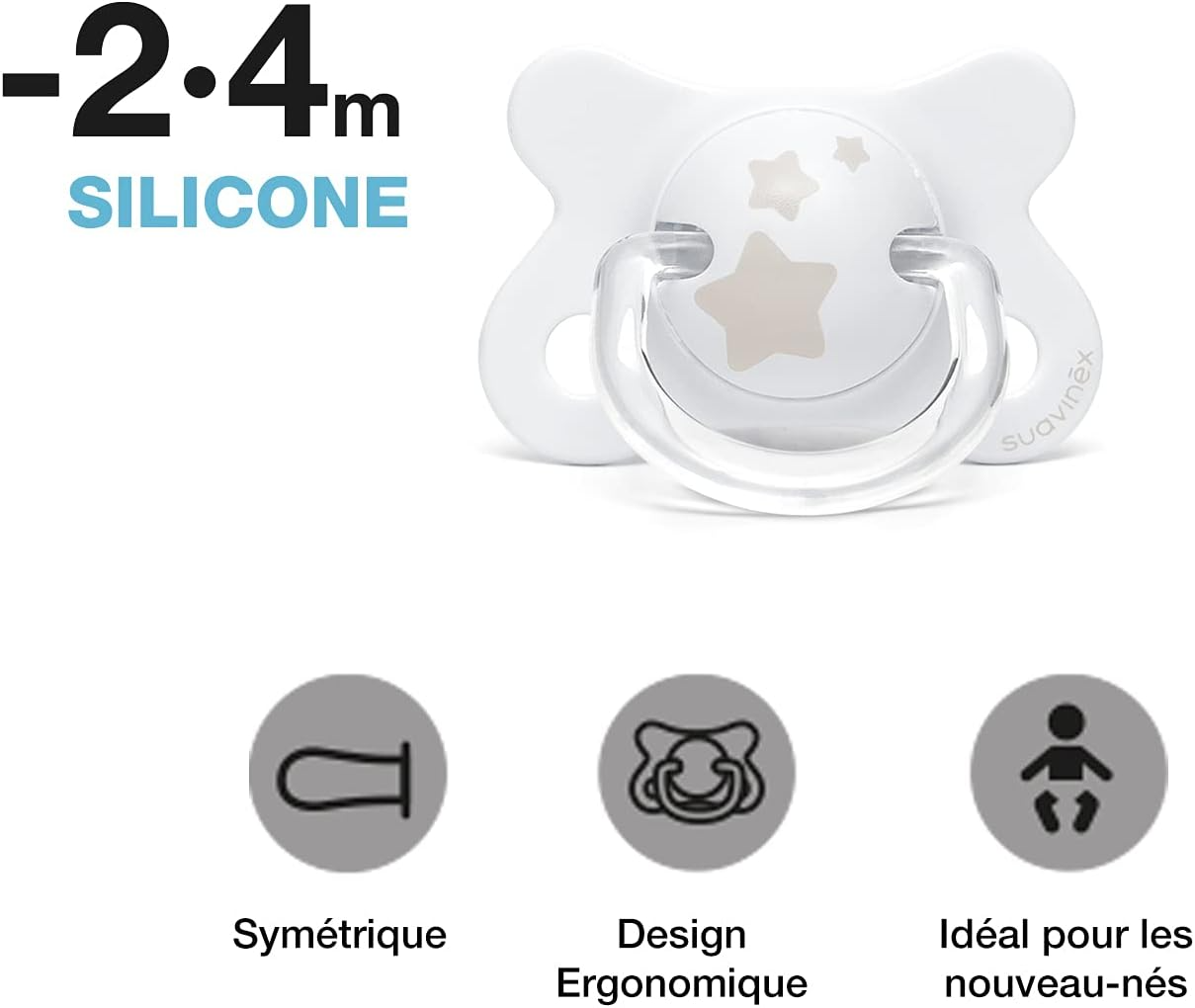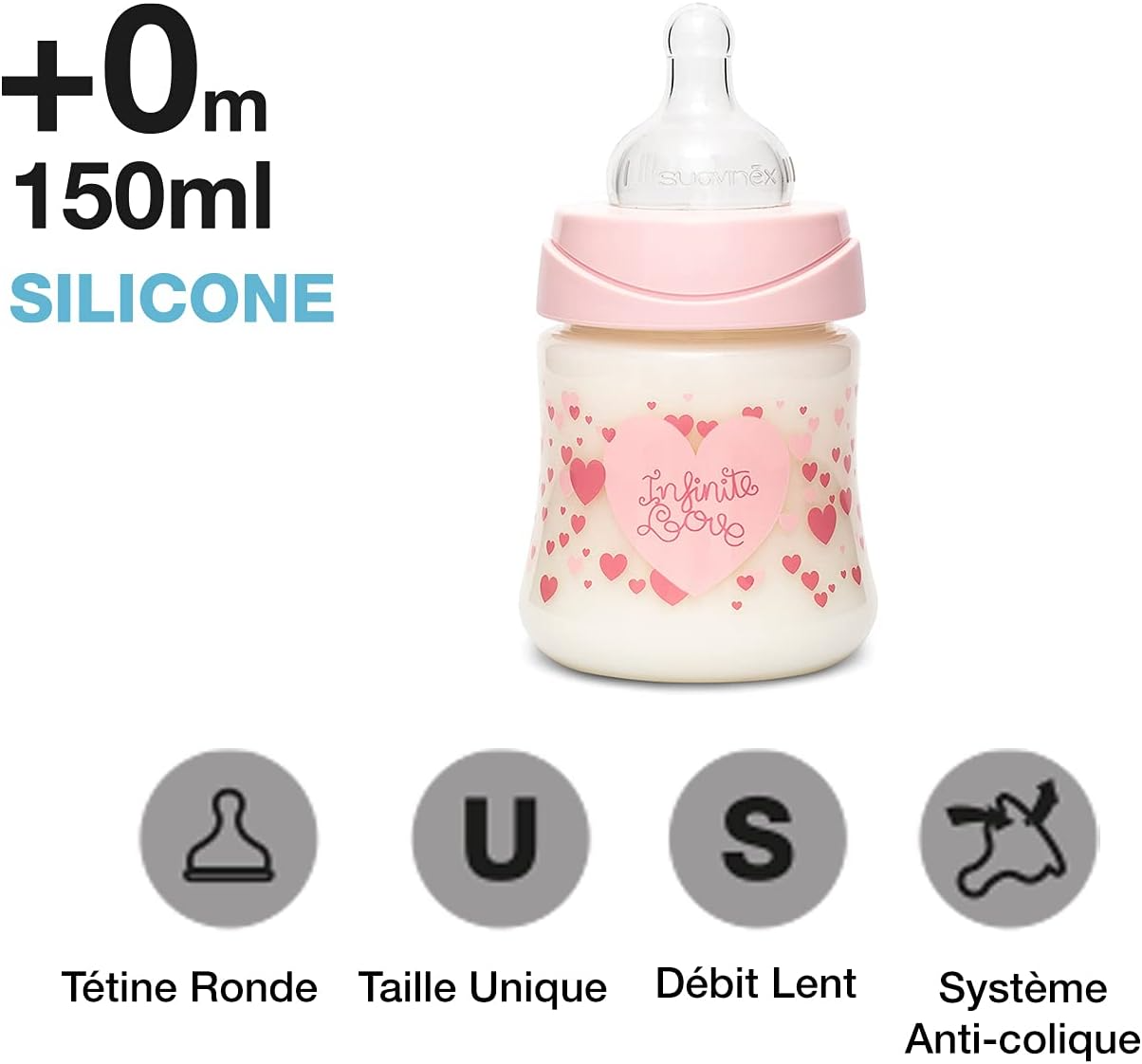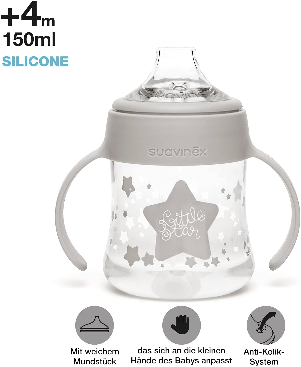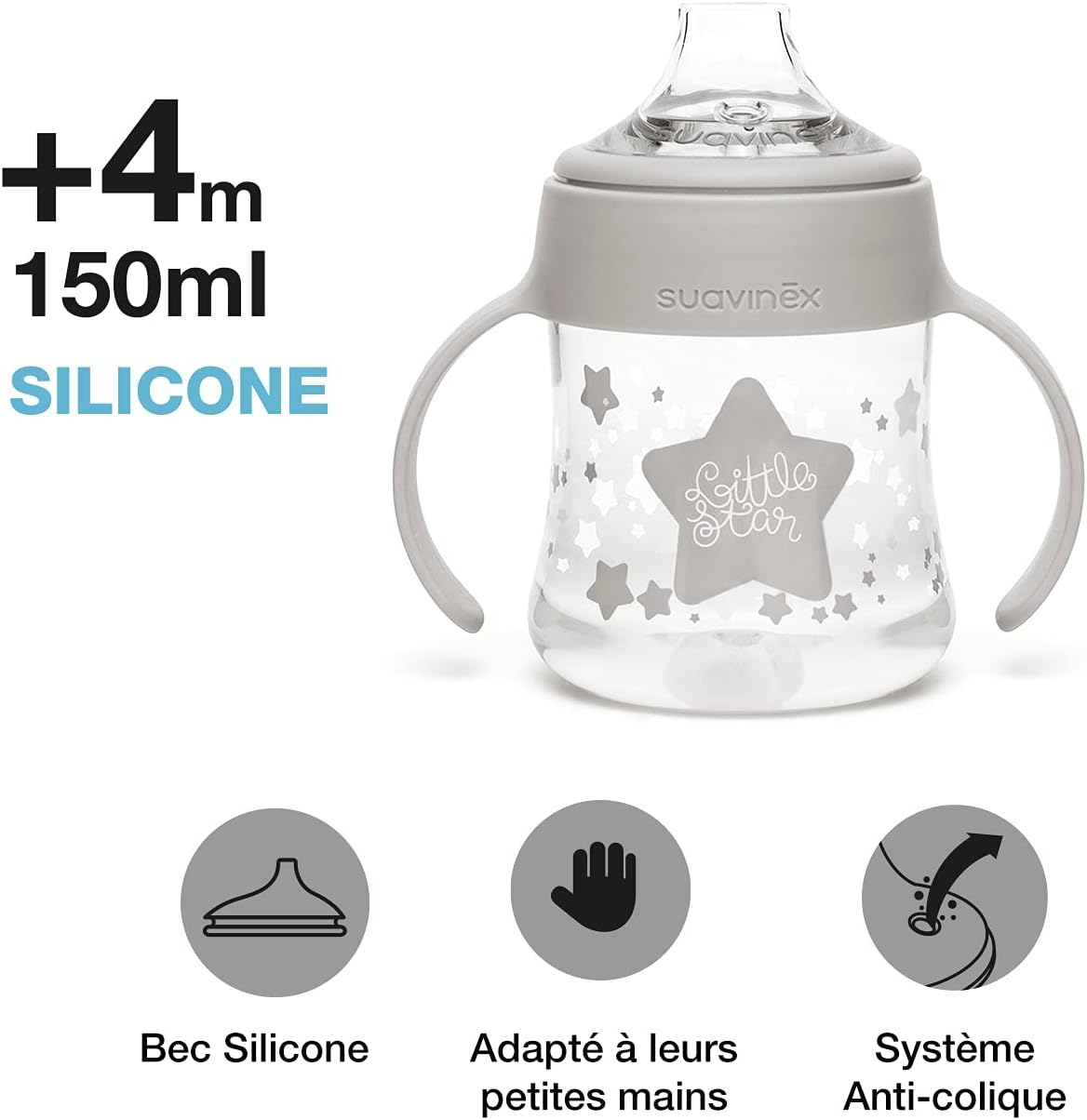 SUAVINEX Conjunto para recém-nascidos, 2 mamadeiras 270 ml + mamadeira 150 ml + biberão 150 ml com pegas + chupeta fisiológica -2-4 meses com tetina de silicone, cor: branco