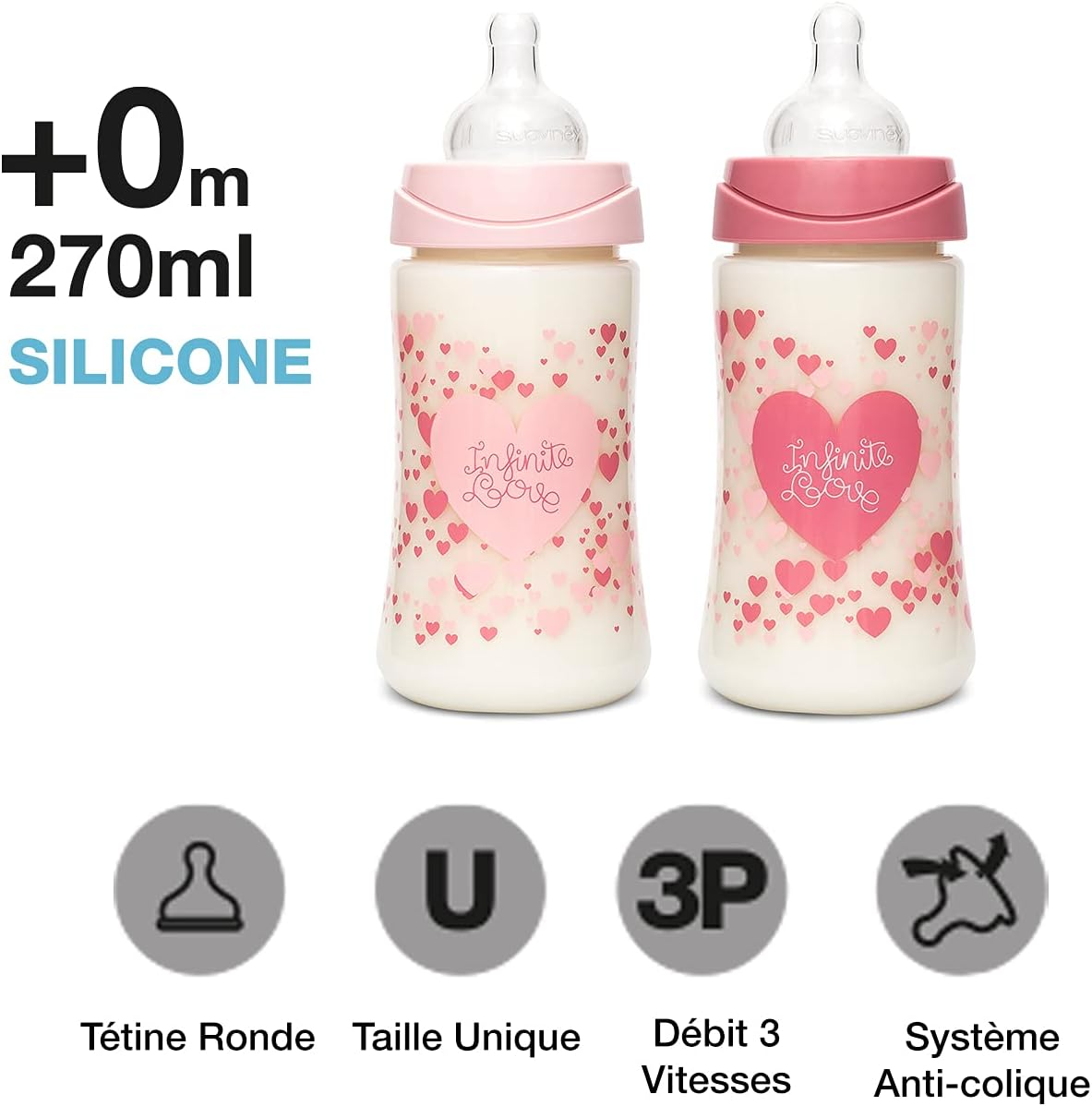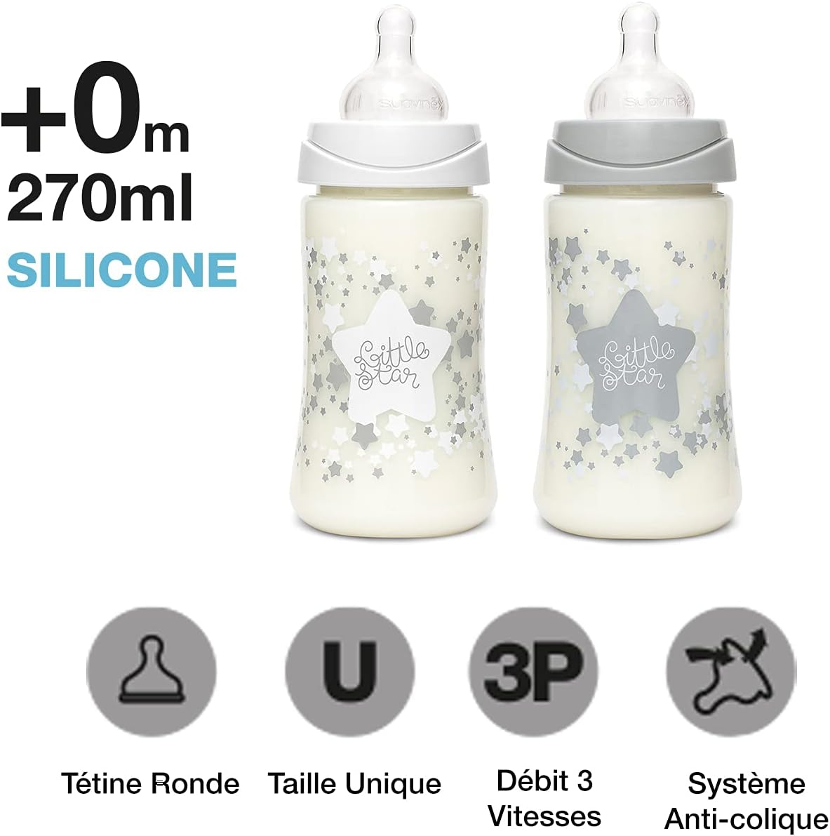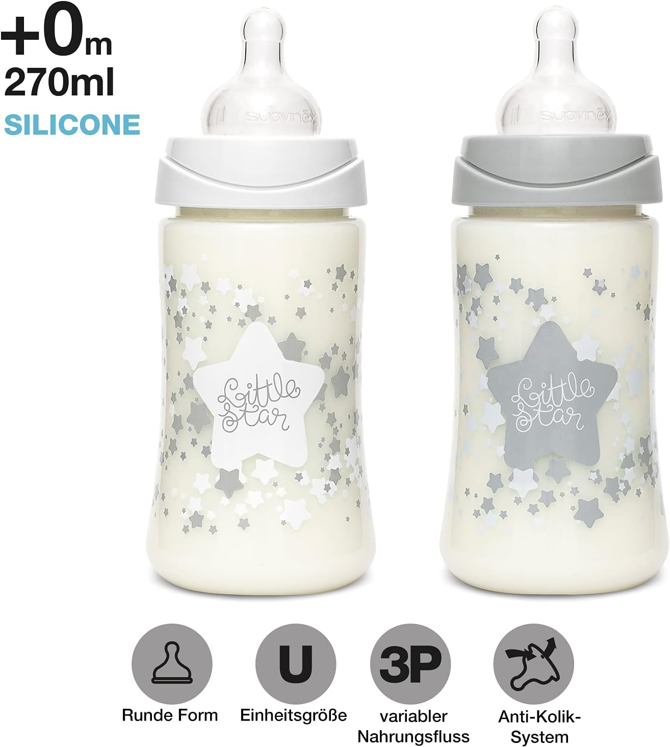 - 2 biberões de 270 ml com bico redondo de silicone com 3 posições que se adaptam ao ritmo de sucção do bebé. Este bico está equipada com um sistema anti-cólicas.