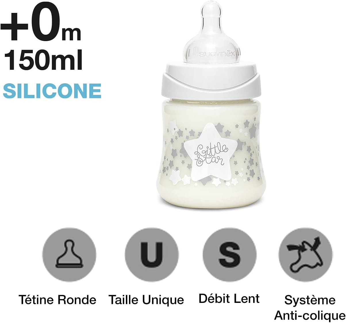 - 1 mamadeira 150 ml com tetina redonda de silicone de fluxo lento, ideal para os primeiros dias de vida do recém-nascido. Este bico está equipada com um sistema anti-cólicas.