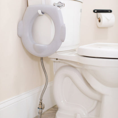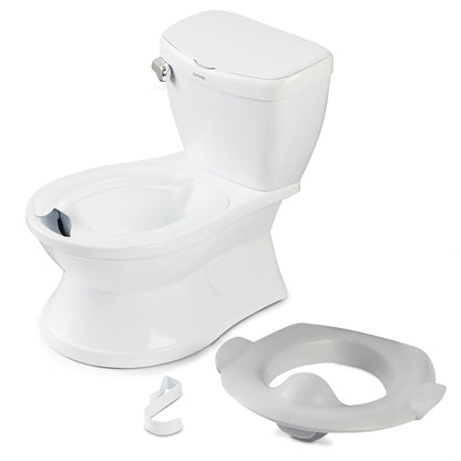 Os recursos incluem design realista e som de descarga, proteção contra respingos, compartimento de limpeza de tamanho completo, tigela removível, penico de espuma macia e gancho de armazenamento.