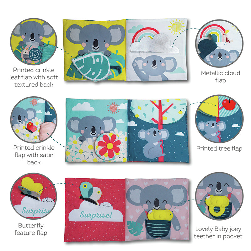 Este grande livro de carrinho de 15 cm x 15 cm foi projetado para atrair bebês a partir dos 6 meses de idade. As páginas macias envolventes incluem abas peek a boo com texturas diferentes, encorajando o bebê e os pais a participarem da busca lúdica de Kimmy Koala por seu adorável bebê Joey. O livro do carrinho está repleto de cores vivas, ilustrações encantadoras e recursos divertidos, como amassados e seções peek a boo para encorajar o bebê em suas descobertas. Diversão de elementos sensoriais, este livro encorajará as habilidades motoras finas, o desenvolvimento sensorial e cognitivo, ao mesmo tempo em que se diverte. Mantenha o seu filho entretido no carrinho de bebê ou na cadeirinha do carro e certifique-se de que o livro nunca se perca usando o anel prático para prendê-lo no carrinho ou na bolsa e pronto!