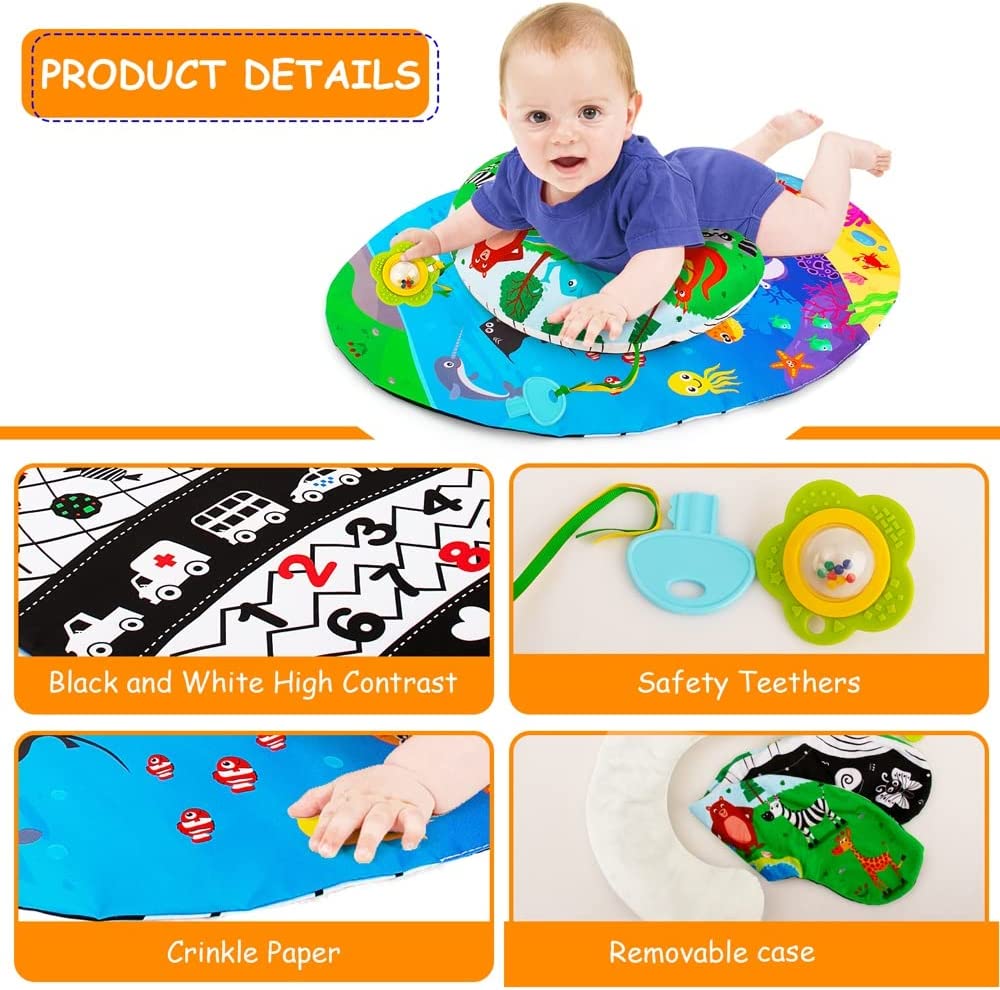 - 【Make Tummy Time Fun】: Nossos brinquedos para bebês incluem 1 * brinquedo de travesseiro para a barriga, 1 * papel enrugado e 2 * brinquedos para dentição. O papel enrugado e os mordedores tornam a hora da barriga divertida e ativa para o bebê. Os brinquedos de dentição do bebê podem aliviar o desconforto das gengivas de dentição do bebê, e os brinquedos de dentição da criança também podem ajudar no desenvolvimento do cérebro e melhorar a coordenação mão-olho. O pano enrugado pode atrair a atenção do seu bebê e ajudar a fortalecer os músculos das pernas e braços do bebê em preparação para engatinhar.