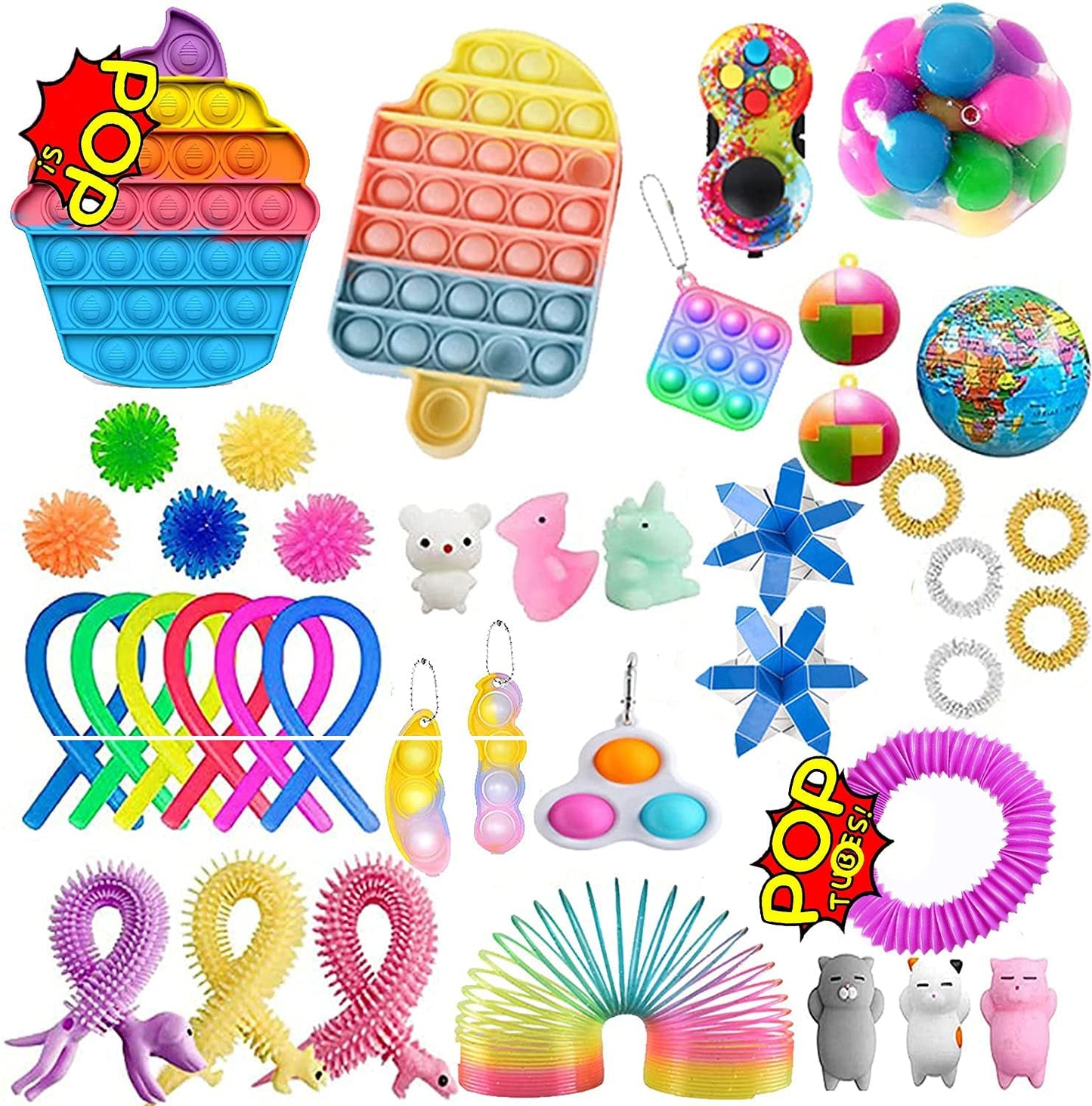 【Brinquedos Fidget baratos】 Os pacotes incluem Pushs Pops Pop Bubbles coloridos Fidget Sensory Toy, Tubos de ansiedade, Stress Relive Balls, Tracks, Chain Fidget Toy, Stretchy Strings, Squeeze ou Beans, Marble Meshs, Infinite Cubes, Squeeze items.