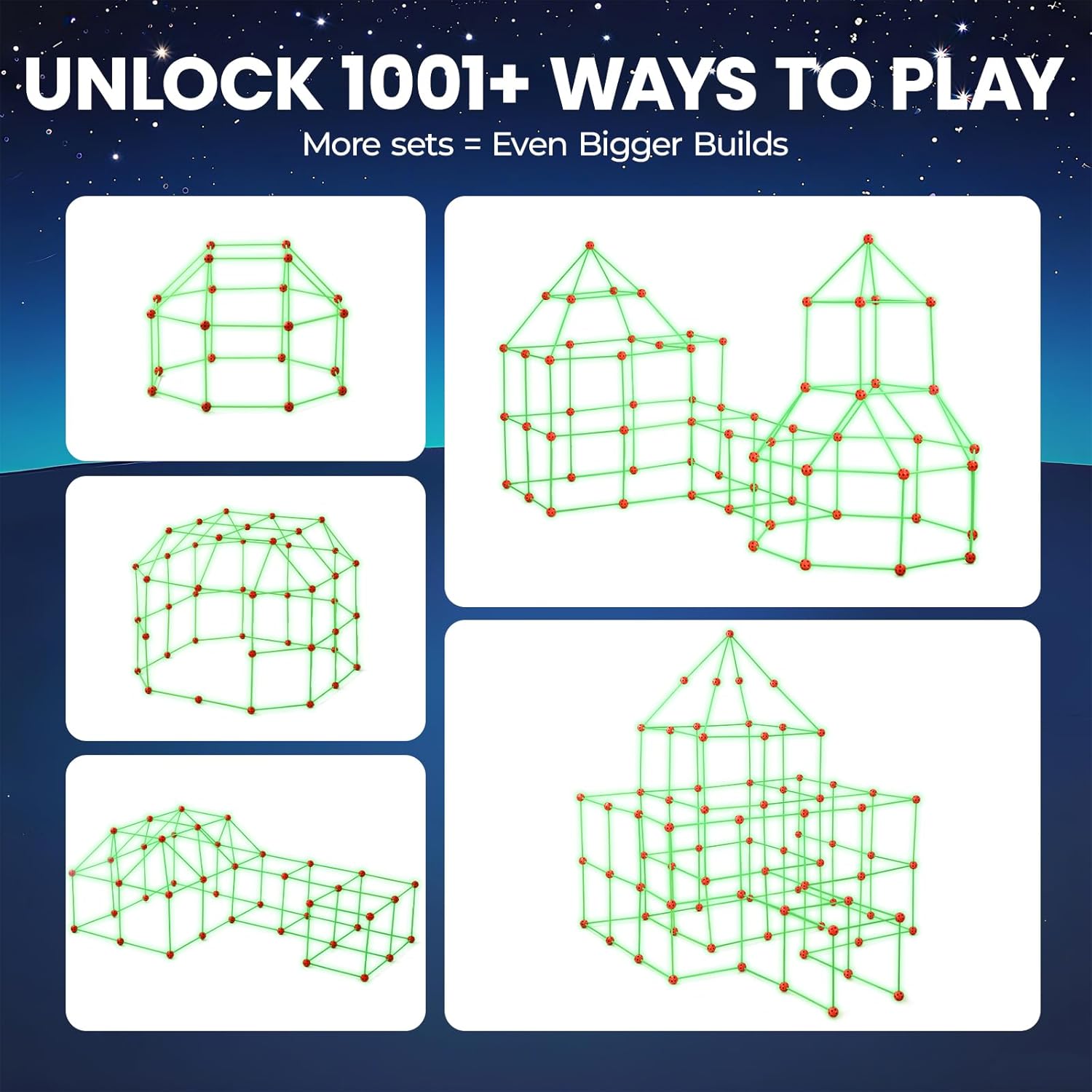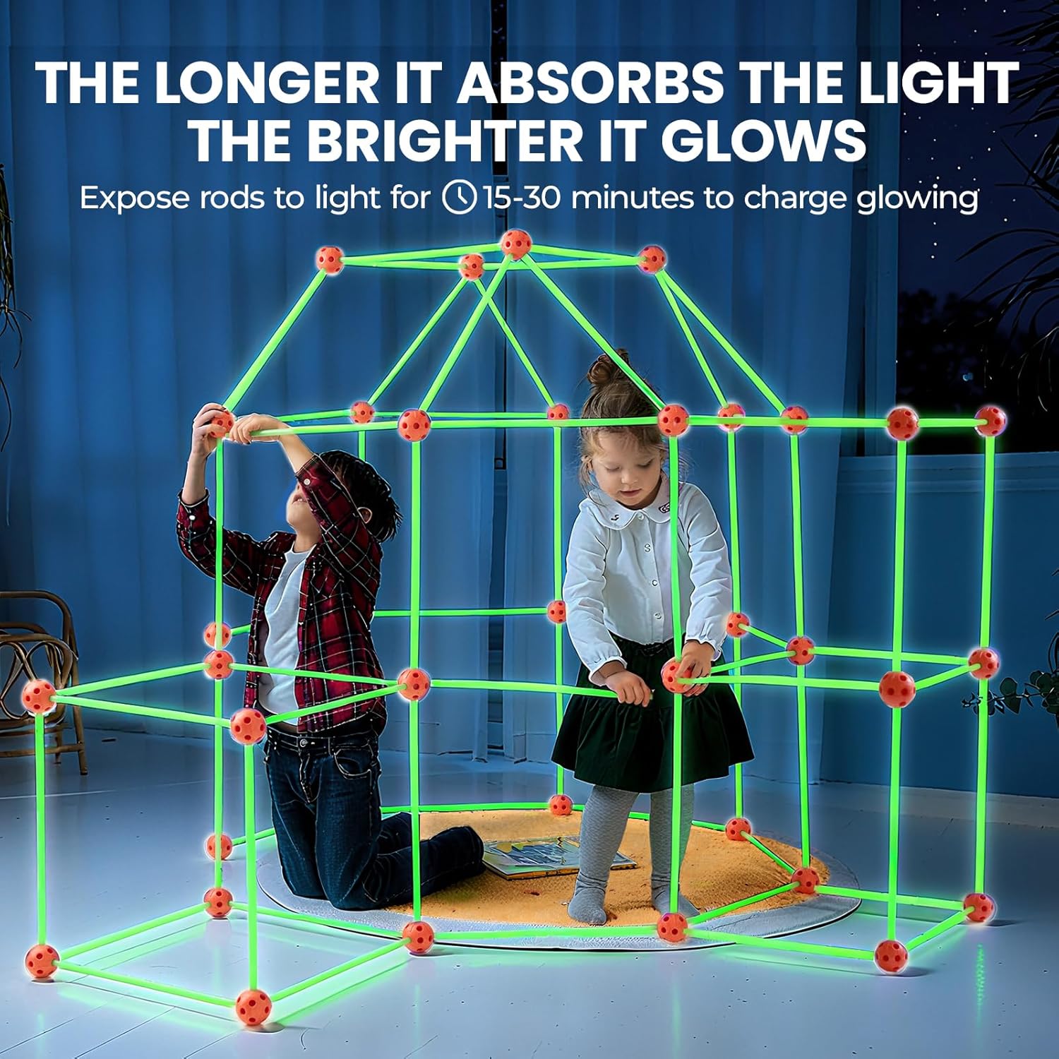 - Kit para Construção de Fortes para Crianças: Basta adicionar um lençol para diversão sem fim! O kit criativo para construção de fortes contém 86 varetas (que brilham no escuro) e 44 bolinhas, e é fácil de montar. O recurso de brilhar no escuro é único e maravilhoso! Seus filhos ficarão surpresos e vão adorar! Perfeito para crianças de 5 a 10 anos construírem diversos tipos e tamanhos de casinhas ou bases secretas, tanto em ambientes internos quanto externos.