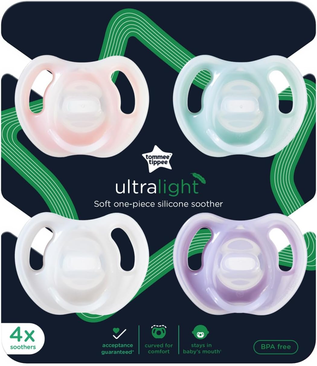 Tommee Tippee Chupetas ultraleves, 0-6 meses, 4 pacotes de silicone de uma peça, polipropileno, manequins multi sem BPA