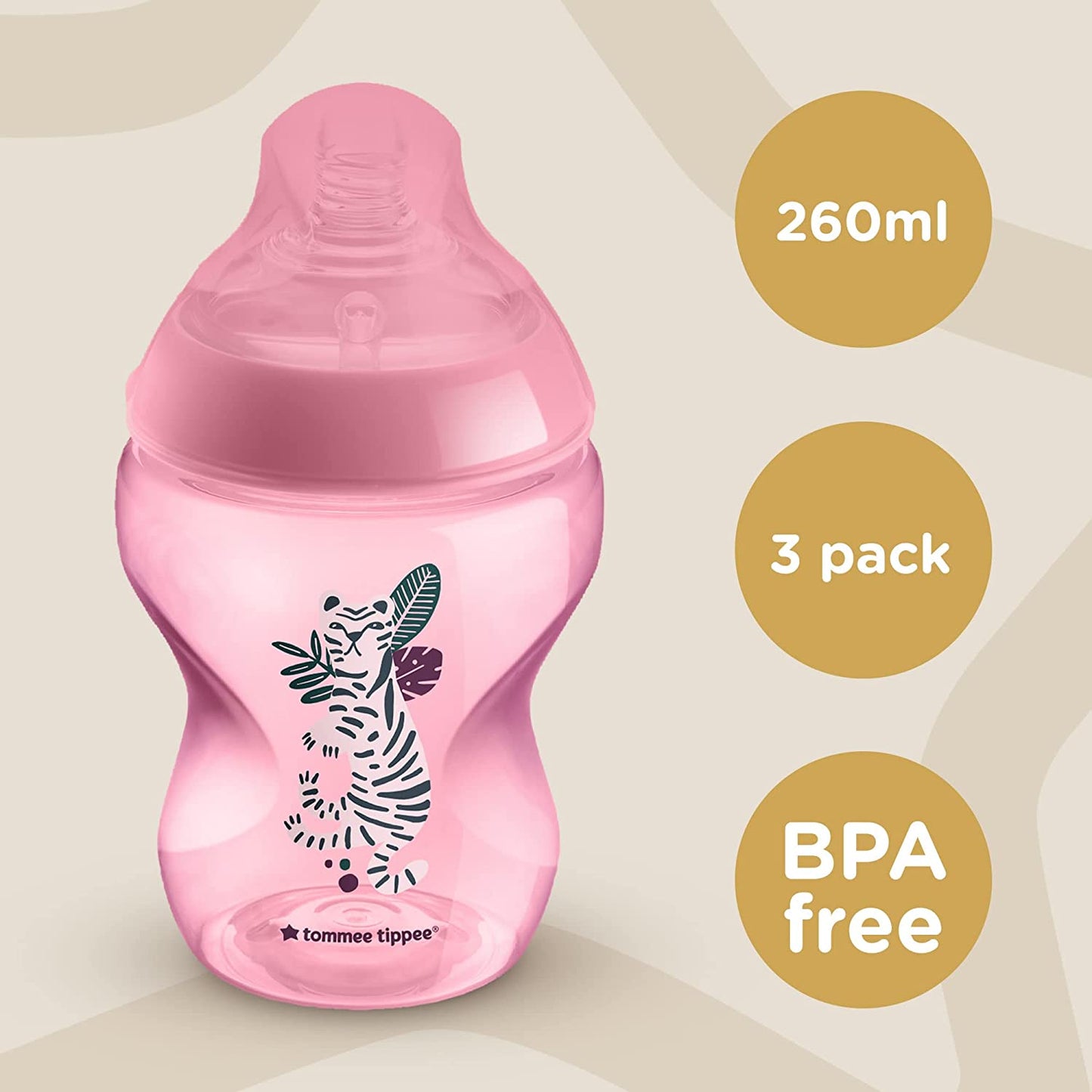 Tommee Tippee - Closer to Nature - Mamadeiras Fluxo Lento com Válvula Anti-cólica - 260ml - Kit com 3 - Rosa