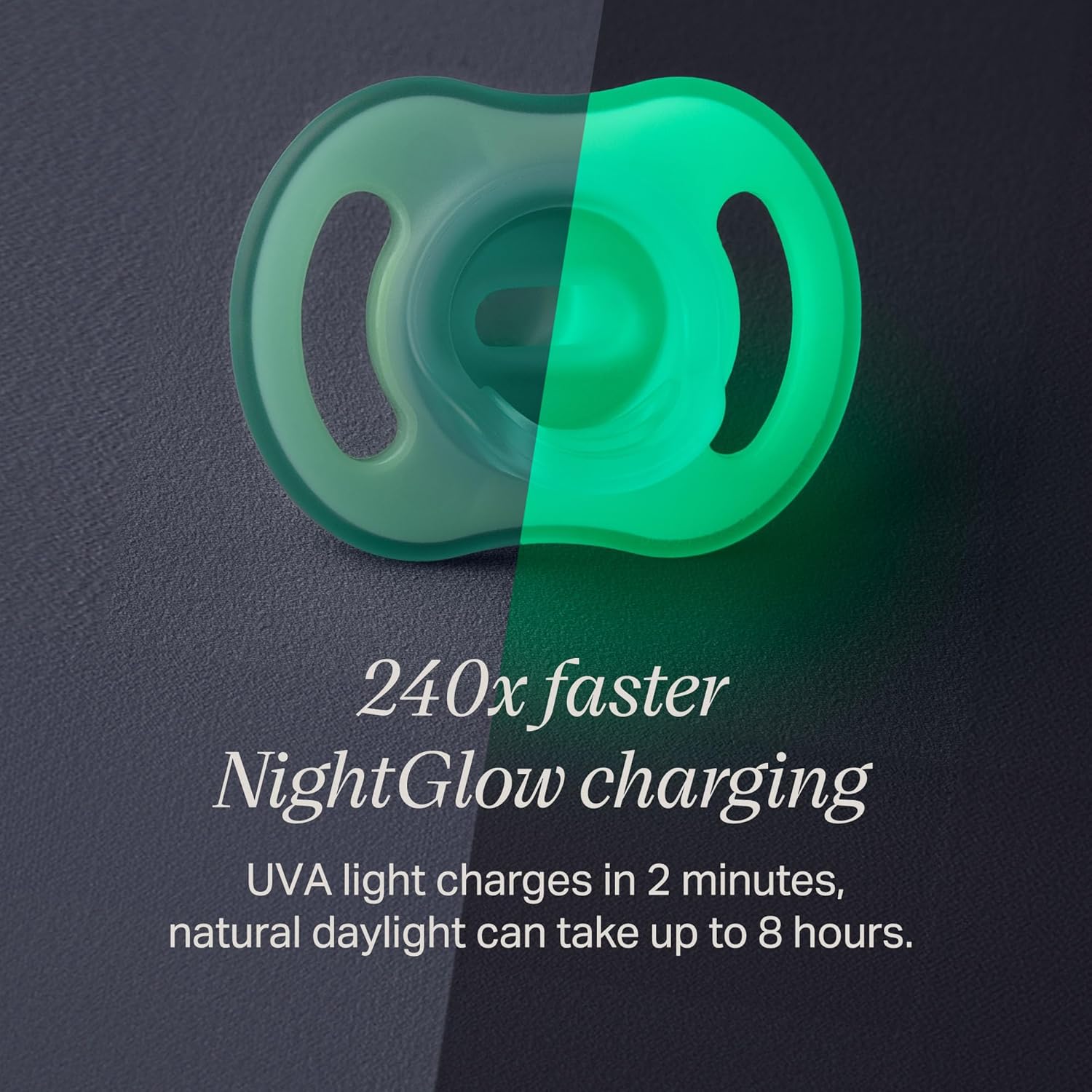 - Carregamento NightGlow até 240 vezes mais rápido: a luz UVA carrega chupetas que brilham no escuro em 2 minutos, enquanto a luz natural leva até 8 horas.