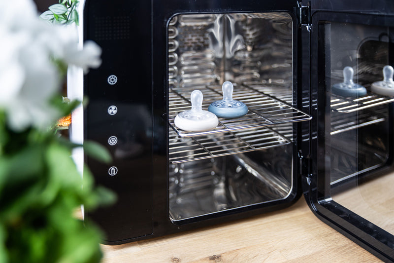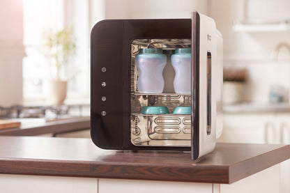 Bactérias no leite restante podem causar percevejos desagradáveis, por isso é importante esterilizar todo o kit de alimentação do seu bebê. A luz ultravioleta (UV) neste esterilizador mata 99,9% dos microrganismos, incluindo bactérias e mofo. Não há vapor, nem produtos químicos, apenas uma maneira segura e simples de esterilizar, secar e armazenar os biberões e acessórios do seu bebé.