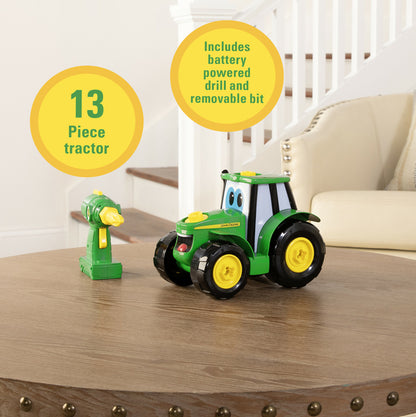 - Feito de peças grossas, fáceis de montar para mãos pequenas. Inclui furadeira com 1 broca e 13 peças Johnny Tractor.