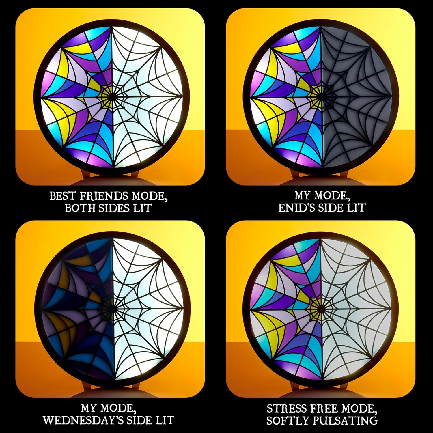 - MODOS DE LUZ MÚLTIPLA: Use o botão secreto para navegar pelos 4 modos de luz. 1. Ilumina o lado de Enid ou 2. o lado de Wednesday da janela. 3. Ilumina ambos os lados. 4. Luz pulsante suave em ambos os lados, o de Enid e o de Wednesday!