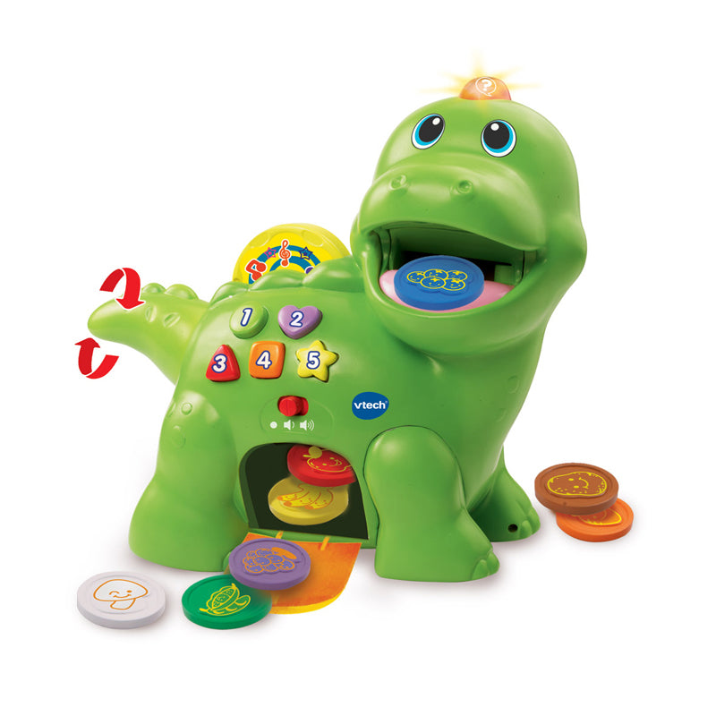 O Dino apresenta 2 modos diferentes de jogo, 5 botões de pressão que introduzem números, contagens, notas musicais e formas e um botão de cabeça iluminada que aciona um jogo de perguntas e respostas para incentivar o jogo e o aprendizado repetitivo.