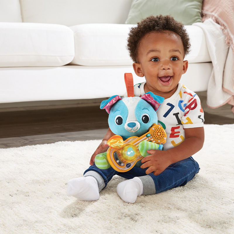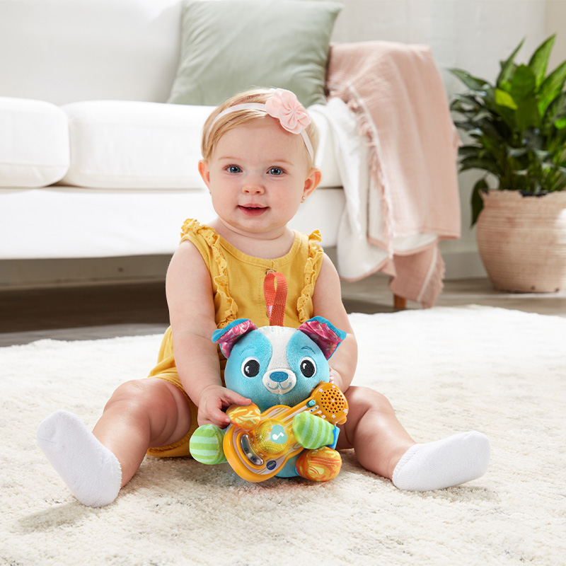 Vamos dedilhar as cordas e começar a cantar! Eu gosto de tocar violão! Divirta-se descobrindo música com a adorável guitarra Puppy Sounds da VTech®!