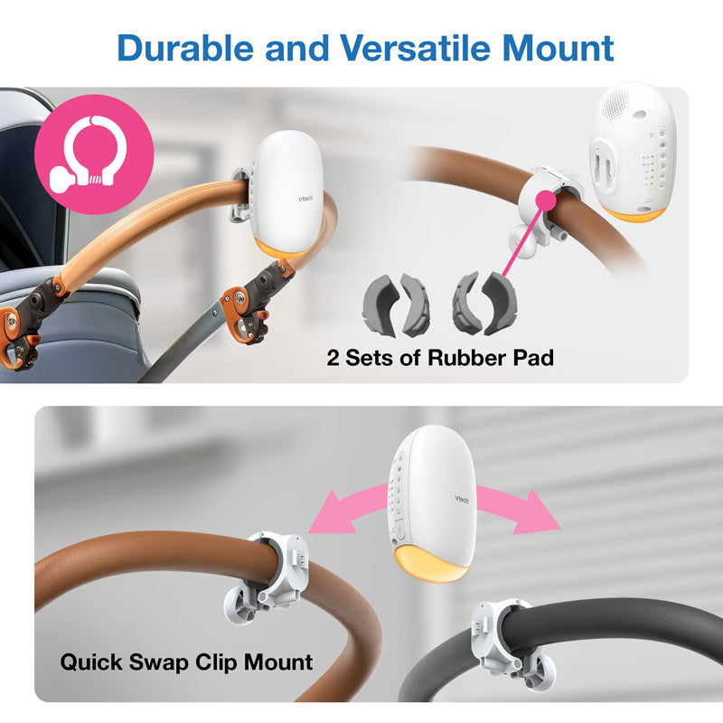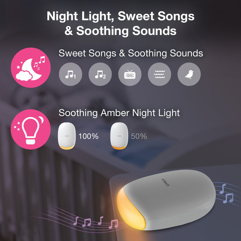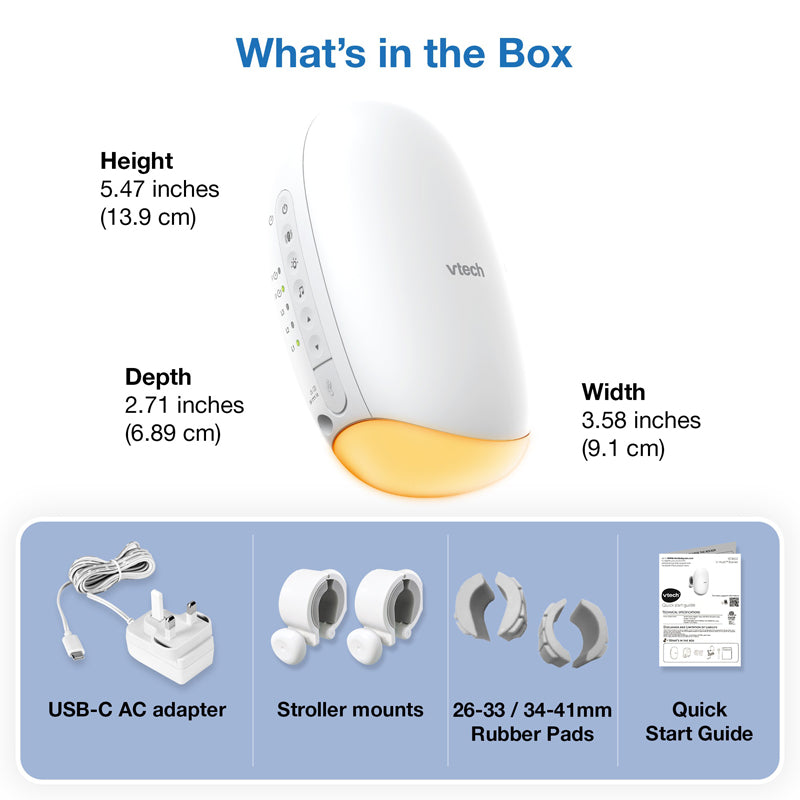 Acalme seu bebê para dormir com o Balanço Sonoro e de Movimento VTech BC8611 V-Hush com Luz Noturna. O mecanismo de balanço interno gira, criando um movimento suave quando acoplado ao carrinho de bebê. Acalme seu bebê com a luz noturna âmbar ou reproduza sons relaxantes e canções de ninar. Não se preocupe se for pego pela chuva, graças ao design resistente a respingos IPX2. E o melhor de tudo: você pode escolher entre três níveis de balanço para criar a noite de sono perfeita.