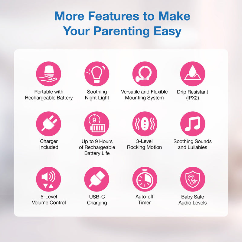 - Balança suavemente o seu bebê em qualquer lugar ou em casa - Fixe este dispositivo de som e movimento ao seu carrinho de bebê para criar um movimento suave que simula o ato de embalar o seu bebê para dormir.