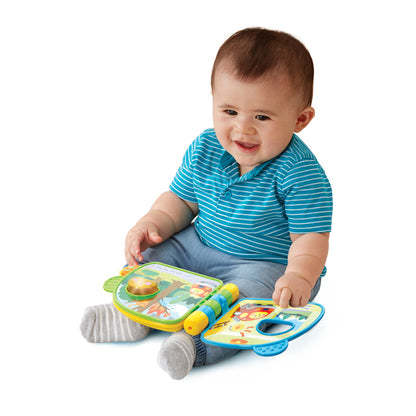 Inclui um botão de música que reproduz 15 melodias e 4 cantam ao longo de canções e rodas rolantes para ainda mais diversão. Promove estimulação auditiva e habilidades iniciais de linguagem.