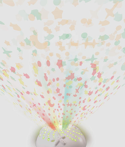 Esta lâmpada giratória mágica e projetor de luz tem como tema o oceano para a diversão dos mais pequenos. Enquanto seu bebê vai dormir, ele pode observar seus amigos do oceano nadando ao redor da lâmpada ou observar os padrões de luz suave brilhando no teto a partir do projetor. Apresenta canções suaves, canções de ninar pacíficas, sons suaves do oceano e ruído branco. Use o controle remoto para reproduzir ou pausar a música, sons ou luzes.