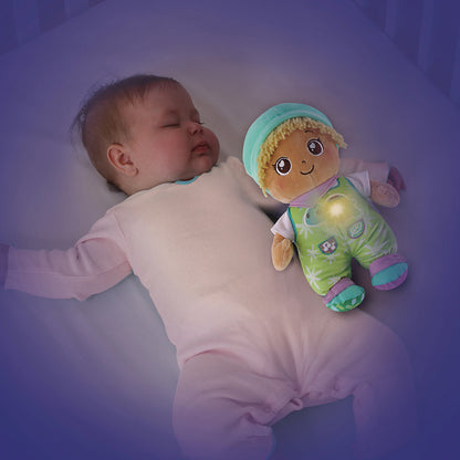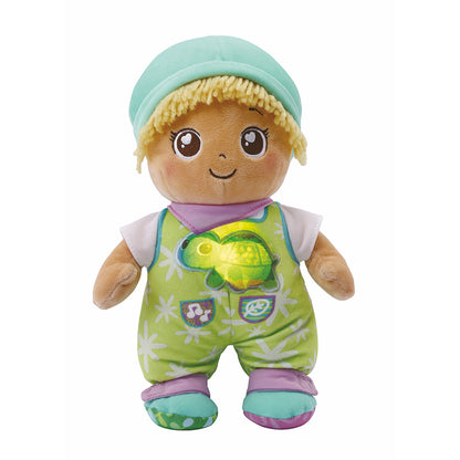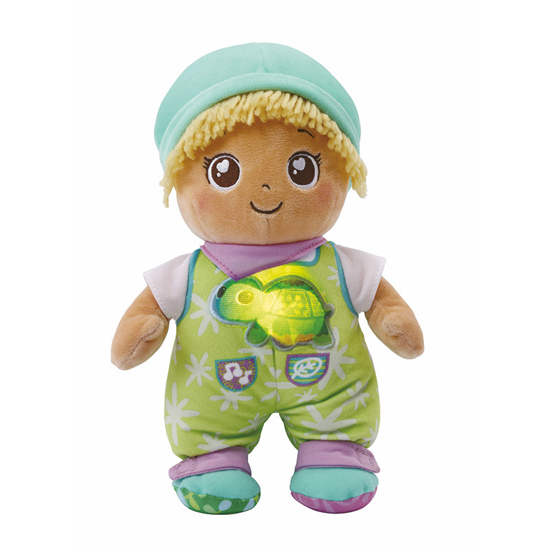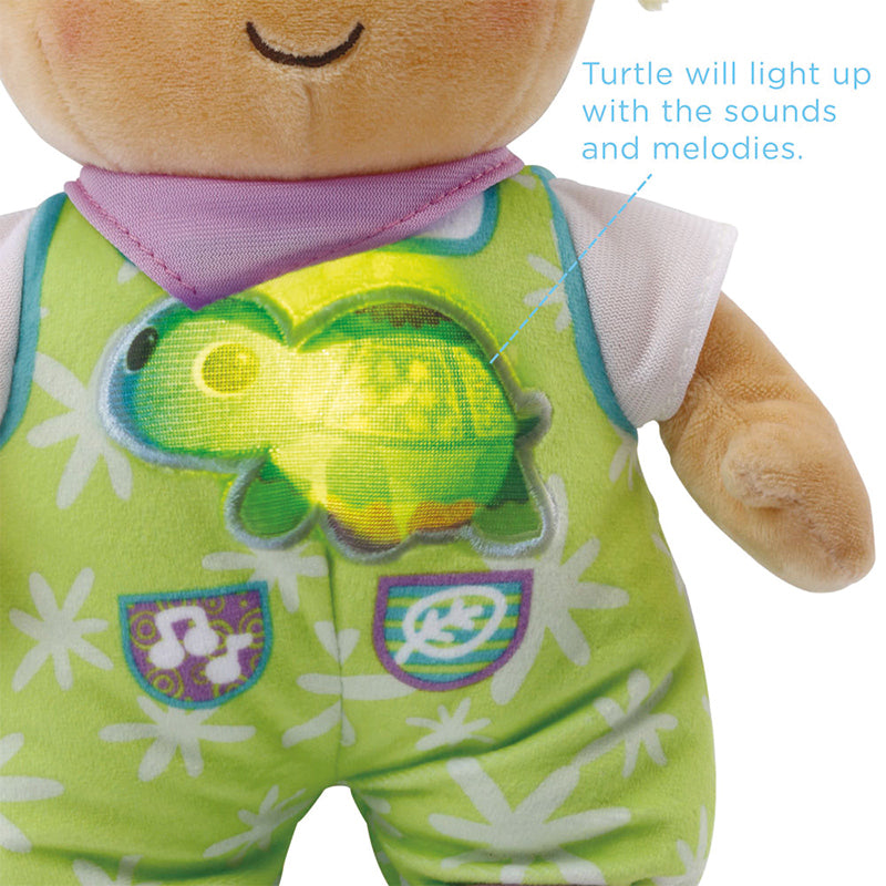 A linda tartaruga nas roupas da boneca vai se iluminar com os sons e melodias e vai aparecer e desaparecer calmamente com as canções de ninar e sons da natureza. Inclui 3 canções para cantar junto e 40 melodias / canções de ninar.