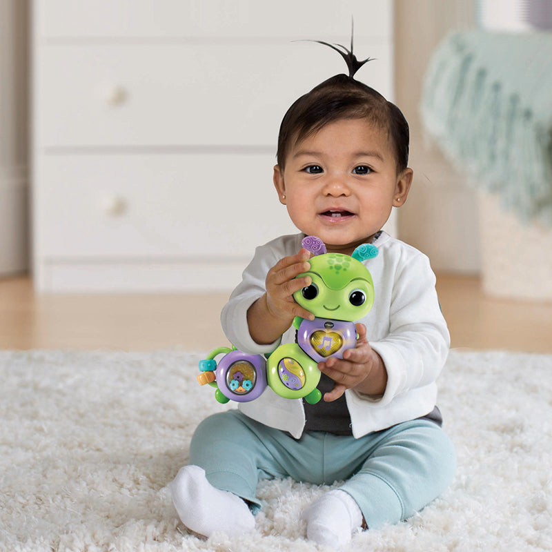Torça os segmentos do corpo da lagarta em novas posições para fingir que está se movendo e acionar um barulho encorajador de clique e tique! Agite as contas, gire os anéis e pressione o botão do coração para estimular a audição e as habilidades motoras finas do seu bebê. Pressionar o botão do coração toca música e frases sobre sentimentos para que seu bebê possa desenvolver suas primeiras habilidades de linguagem.