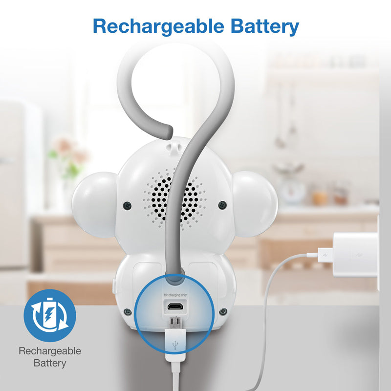 O Macaco Sonoro Portátil V-Hush permite que você prenda o rabinho extensível do macaquinho na alça do carrinho, na maçaneta da porta ou até mesmo na cadeirinha do carro do seu bebê, e leve um pouco de tranquilidade para onde quer que você vá. Com cinco melodias relaxantes e cinco sons ambientes suaves, incluindo o som de um riacho e ruído branco, ajude o bebê a adormecer tranquilamente. Com uma luz noturna suave, as bochechas do macaquinho emitem uma luz delicada para acalmar seu pequeno no escuro. Ajustando a intensidade da luz com o botão na barriga, você pode criar a atmosfera perfeita para o bebê. As baterias recarregáveis permitem que você aproveite música e sons em qualquer lugar, sem precisar trocar constantemente as pilhas alcalinas descartáveis.