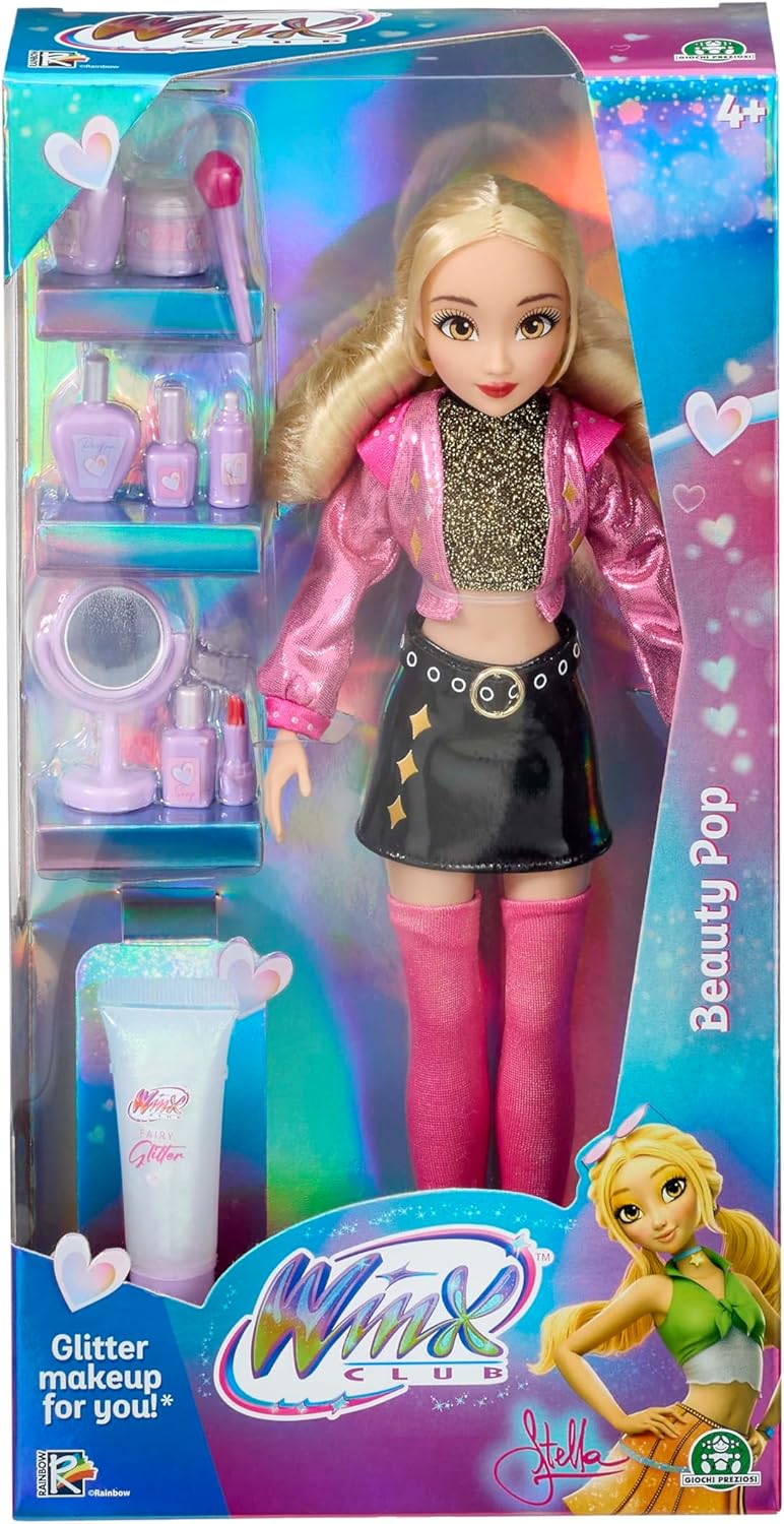 Winx Club Boneca Beauty Pop – Stella com Roupa Glamorosa para Concerto e Gel com Glitter – Boneca Fada Totalmente Articulada com Acessórios de Beleza – Brinquedo Oficial para Meninas – A partir de 4 Anos